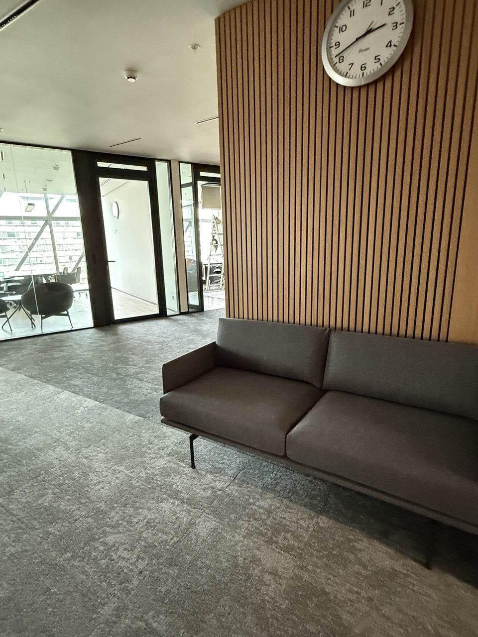 В местах с операторскими и переговорными комнатами применены акустические решения не только в напольных покрытиях, но и в потолочных панелях, которые используются частично как стеновые элементы. Это улучшает звуковую среду помещений и повышает удобство использования.