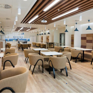 ???Офис компании «Акрихин».???Потолок торговой марки K&R Design: ламель, окрашенная под дерево.? ??Нами были изготовлены, поставлены и смонтированы кубообразные потолочные системы