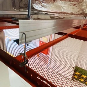 Металлический потолок был смонтирован на открытой подвесной системе Т24 и окрашен на нашем заводе в нестандартный красный цвет.