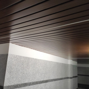 Производство и монтаж реечного потолка K&R Design цвета каштан со светильниками.