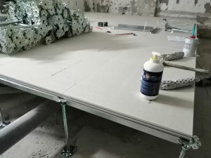 Монтаж неразъёмного фальшпола из сульфата кальция в кухонной зоне кафе.