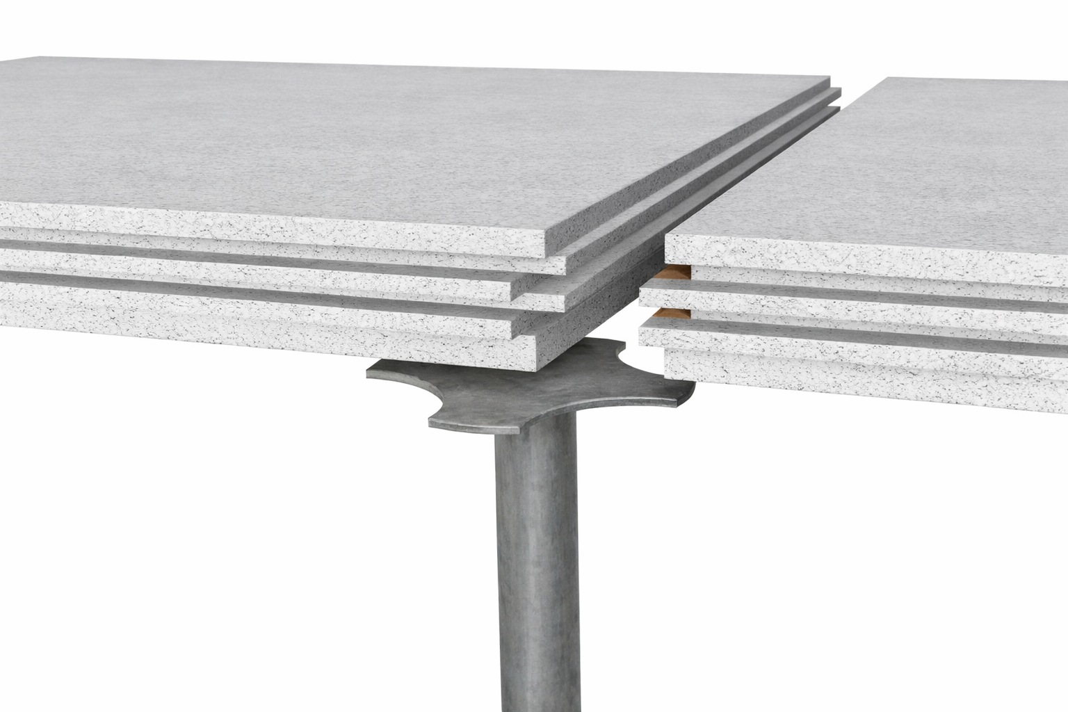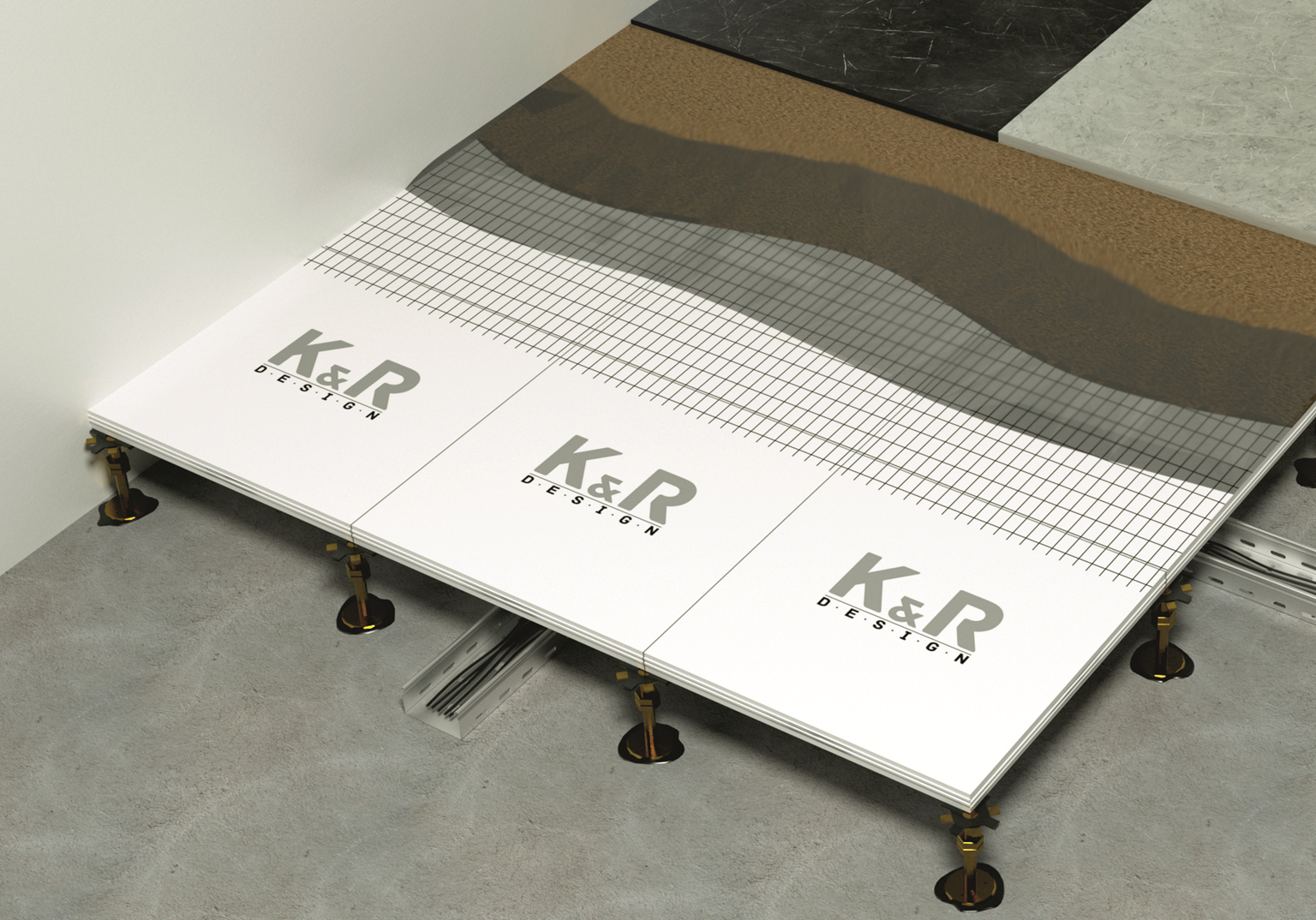 Стойки позволяют точно выставить высоту конструкции и организовать пространство для инженерных коммуникаций, а плиты формируют прочную, негорючую и бесшовную поверхность с нитевидными стыками. Такое решение является эффективной альтернативой бетонной стяжке, имеет малый вес и выдерживает нагрузки до 10 тонн на м². Использование возможно уже через сутки после монтажа.