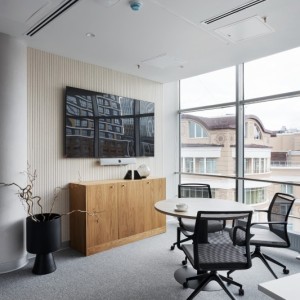 Панели изготовлены специально под проект с разными размерами из войлока — плотного и экологичного материала, обладающего высокими звукопоглощающими свойствами толщиной 9 мм. Благодаря V-образным пазам на поверхности создаётся эффект объёмности, а сама стена приобретает динамичный и современный вид.