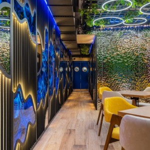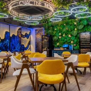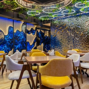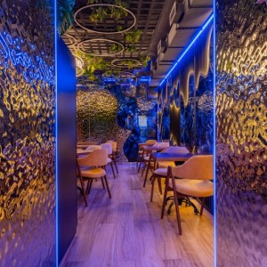Наша компания K&R Design выполнила все работы, связанные с отделкой потолков и стен панелями из нержавеющей стали с эффектом водной ряби в двух цветах: серебряный и золотой.