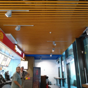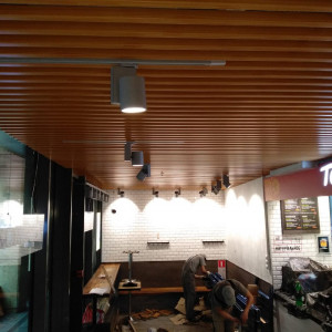 Теремок - Белая площадь Поставка и монтаж потолочных ламелей под дерево.