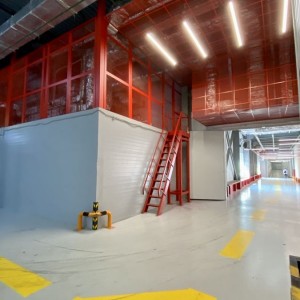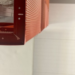 Металлический потолок был смонтирован на открытой подвесной системе Т24 и окрашен на нашем заводе в нестандартный красный цвет.