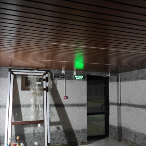 Производство и монтаж реечного потолка K&R Design цвета каштан со светильниками.
