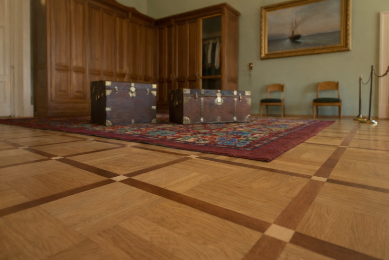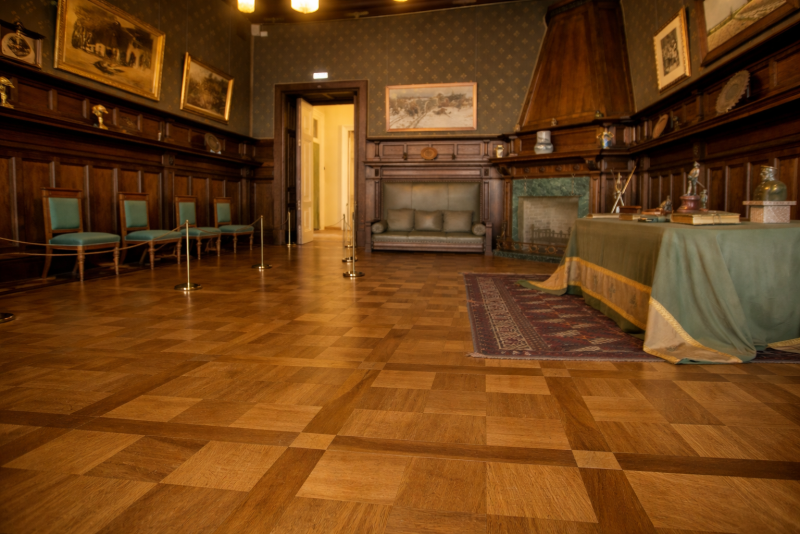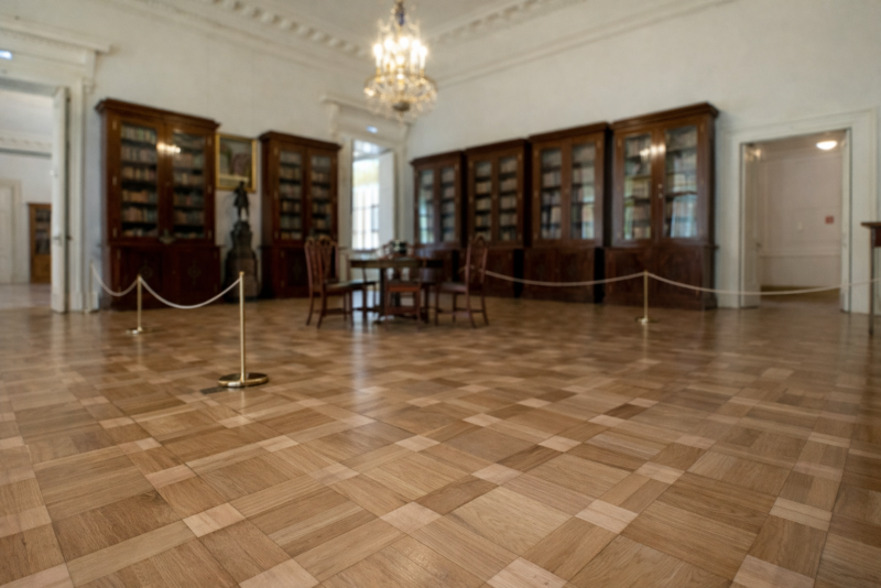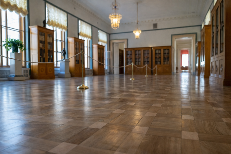Для оформления полов применялись благородные и долговечные материалы: керамогранит, натуральный мрамор и паркет. Каждый элемент подбирался с учётом нагрузок, геометрии помещений и эстетических требований реставрации.