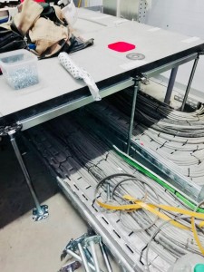 Сложное техническое помещение с развитой системой коммуникаций. Монтаж усложнялся тем, что нужно было совместить схему прокладки коммуникаций с сеткой фальшпола. В карусели видно как много проводов и коммуникаций можно скрыть под системой фальшпола.