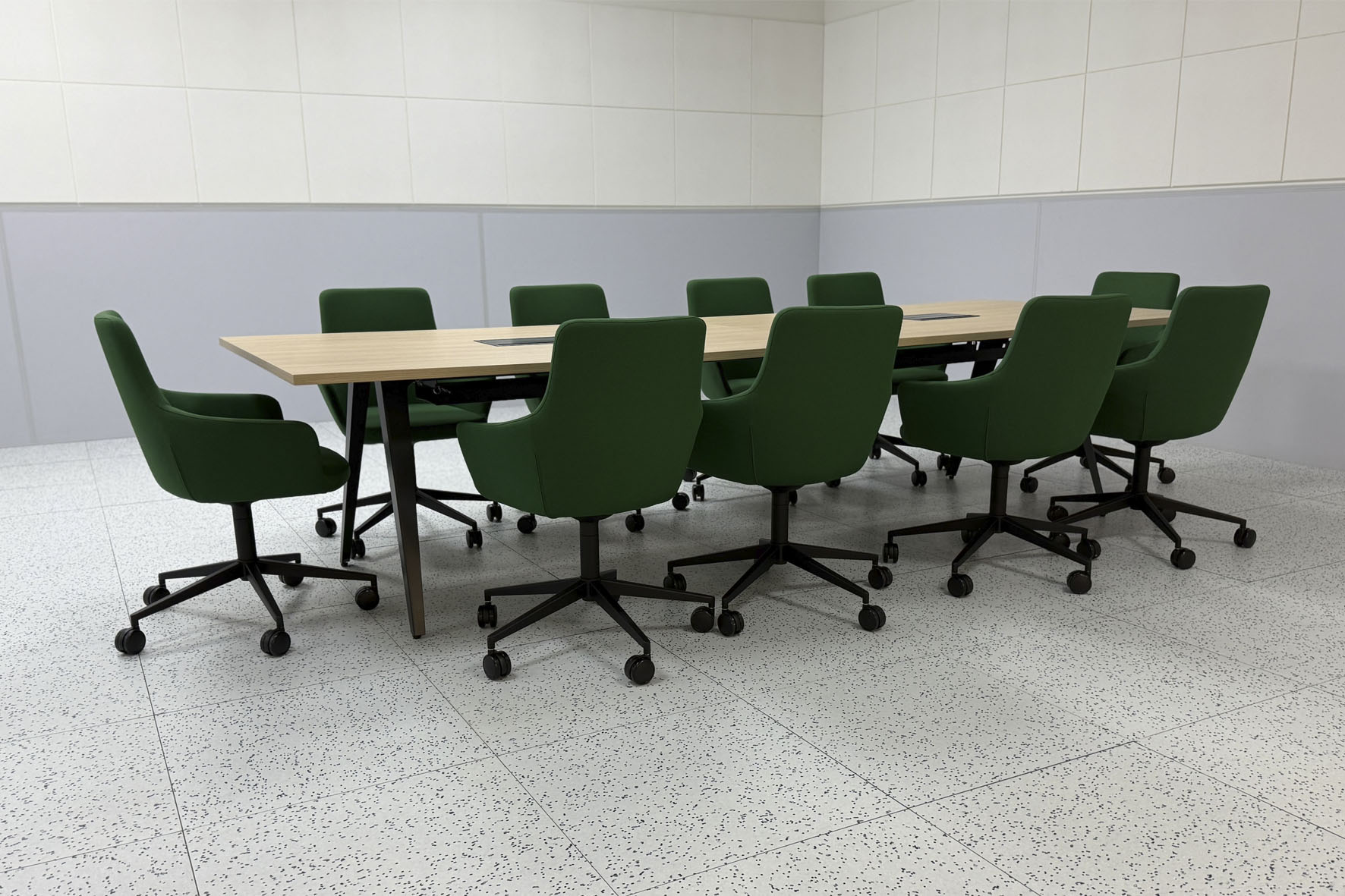 В местах с операторскими и переговорными комнатами применены акустические решения не только в напольных покрытиях, но и в потолочных панелях, которые используются частично как стеновые элементы. Это улучшает звуковую среду помещений и повышает удобство использования.