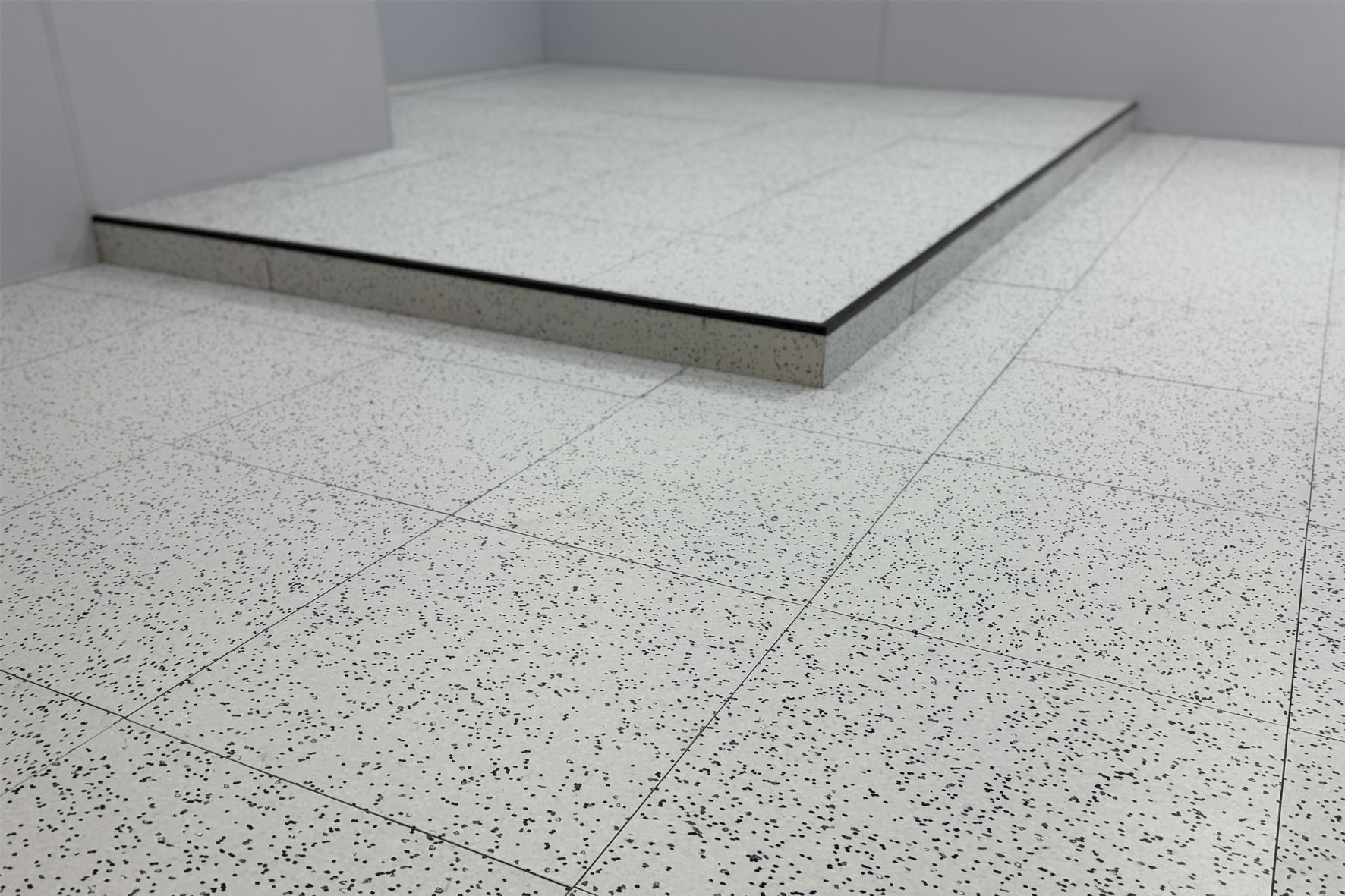 В переходных зонах и коридорах реализована комбинация фальшпола и керамогранита различных форматов: 1200×600 мм и 600×600 мм на стяжке. Такое решение обеспечивает монолитное визуальное пространство и при этом сохраняет доступ к инженерным коммуникациям.
