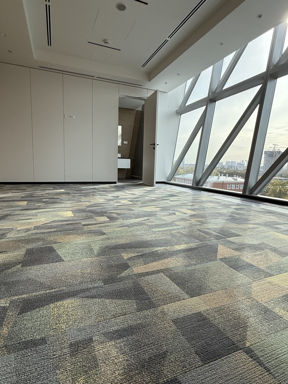 В некоторых кабинетах заказчик выбрал LVT (ПВХ) плитку в рабочих зонах, а ковровая плитка осталась в холлах. Хотя стандартная практика часто обратная, такое решение оправдано с точки зрения практичности и дизайна.